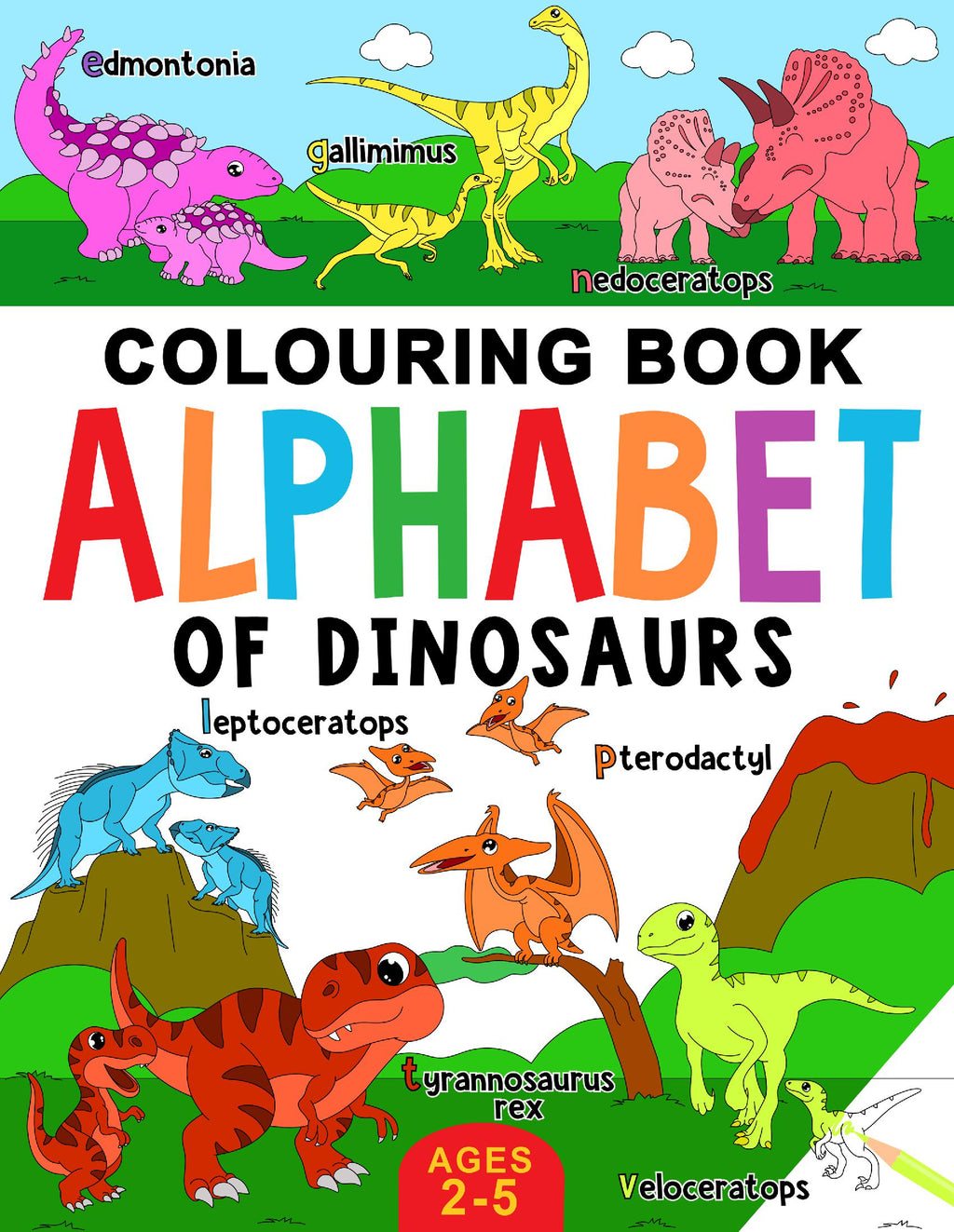 Each image is ideal for a 2 to 5-year-old to enjoy filling with colour, using their imagination and creativity while learning the written alphabet and the names of a wonderful variety of dinosaurs.