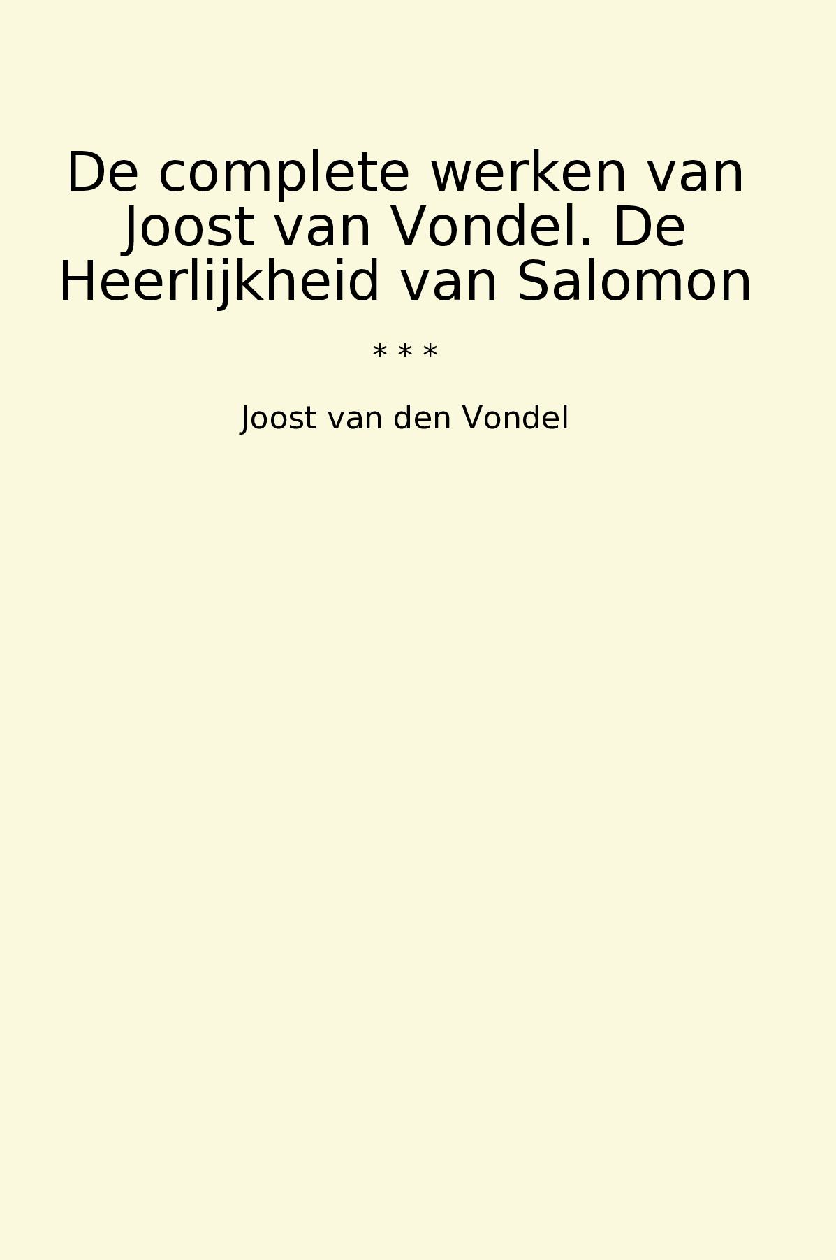 De complete werken van Joost van Vondel: De Heerlijkheid van Salomon is een klassiek boek geschreven door de beroemde Nederlandse auteur en dichter Joost van den Vondel. In dit werk wordt het verhaal van koning Salomo op meeslepende wijze verteld, waarbij thema's als liefde, wijsheid en macht centraal staan. Van den Vondel weet op meesterlijke wijze de karakters tot leven te brengen en de lezer mee te slepen in een verhaal vol spanning en emotie. Zijn rijke taalgebruik en diepzinnige inzichten maken dit boek tot een tijdloos meesterwerk dat nog altijd relevant is. De Heerlijkheid van Salomon is een absolute aanrader voor liefhebbers van klassieke literatuur en Nederlandse geschiedenis.