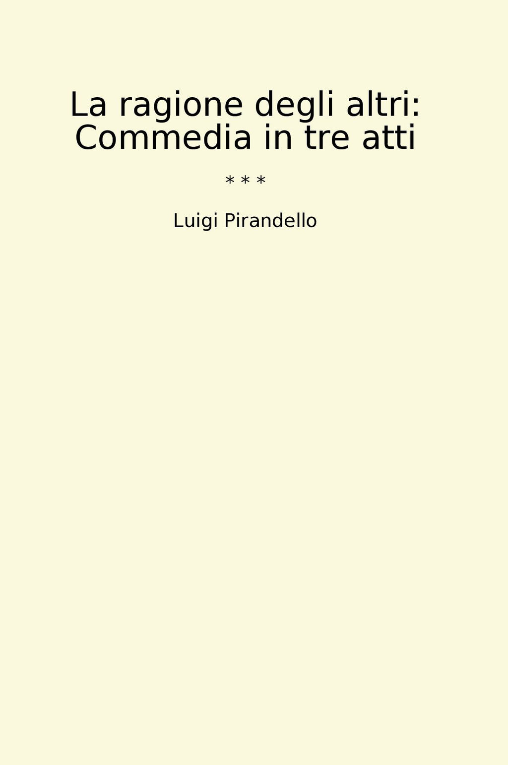 La ragione degli altri è una commedia in tre atti scritta da Luigi Pirandello, uno dei più grandi drammaturghi italiani del Novecento. Quest'opera teatrale mette in scena in modo brillante le contraddizioni e i conflitti delle relazioni umane, esplorando il tema della percezione della realtà e della diversità di punti di vista tra le persone. Attraverso dialoghi serrati e situazioni comiche, Pirandello ci regala uno spaccato della società dell'epoca e ci invita a riflettere sul concetto di verità e su come essa sia soggettiva e mutevole. La ragione degli altri è un classico della letteratura teatrale italiana che oggi, come allora, riesce a catturare l'attenzione del pubblico con la sua ironia e profondità.