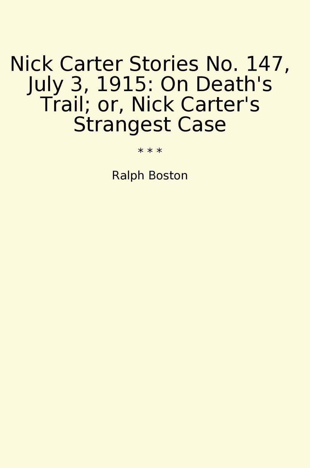 In "Nick Carter Stories No. 147, July 3, 1915: On Death's Trail; or, Nick Carter's Strangest Case" by Ralph Boston, readers are taken on a thrilling adventure with the famous detective Nick Carter as he tackles his most mysterious and dangerous case yet. Facing a cunning adversary and a trail of death, Nick Carter must use all of his wit and expertise to solve the case before it's too late. With twists and turns at every corner, this classic book keeps readers on the edge of their seats as they follow Nick Carter's relentless pursuit of justice. Full of suspense, action, and intrigue, "On Death's Trail" is a must-read for fans of detective fiction and thrilling mysteries.