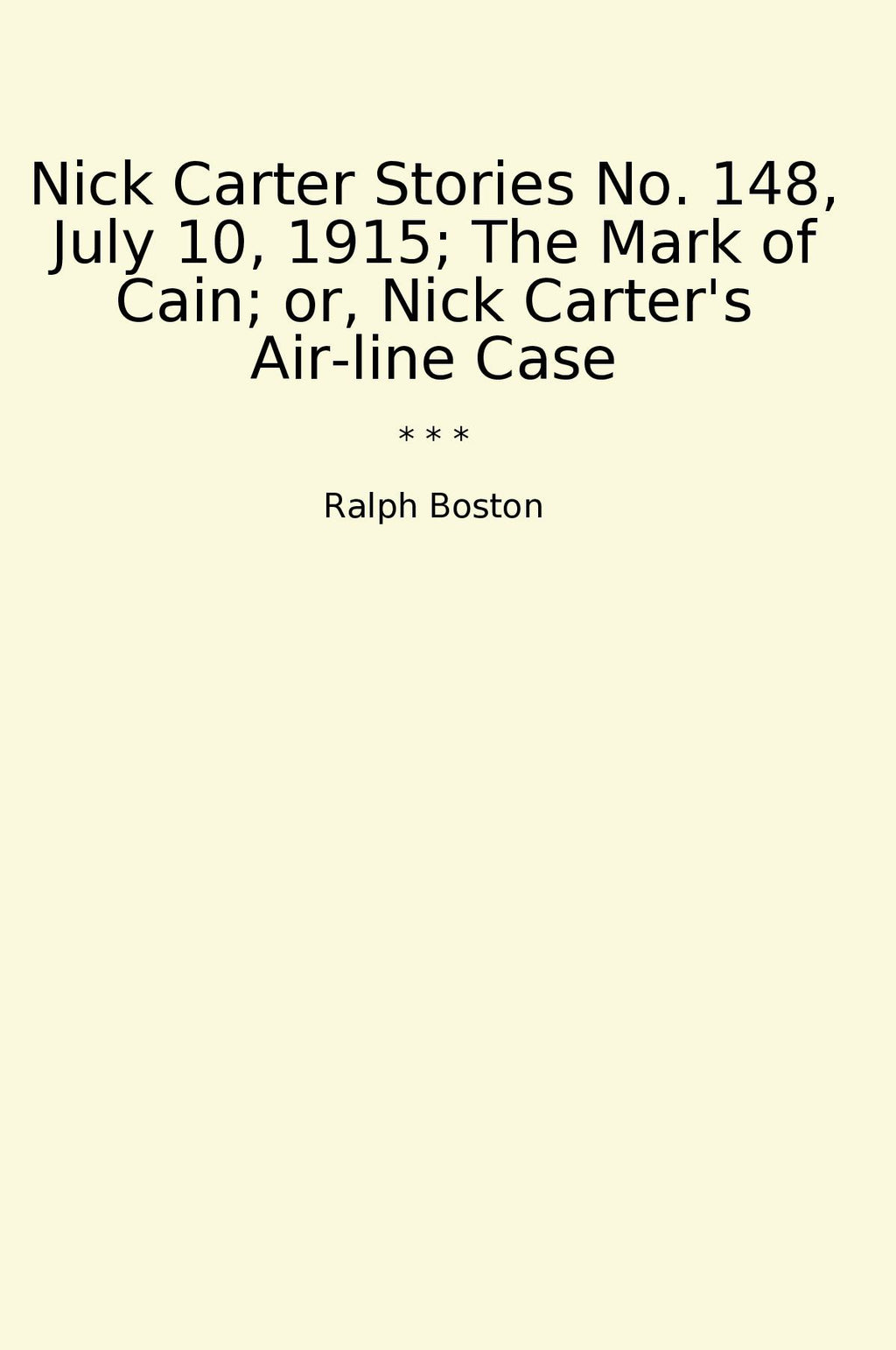 In Nick Carter Stories No. 148, July 10, 1915; The Mark of Cain; or, Nick Carter's Air-line Case, readers are taken on a thrilling adventure with the famous detective Nick Carter. Written by Ralph Boston, this classic book follows Nick as he investigates a mysterious case involving the mark of Cain. As Nick delves deeper into the case, he uncovers a web of deceit, danger, and intrigue that keeps readers on the edge of their seats. With its fast-paced plot, clever twists, and vivid characters, this book is a must-read for fans of detective fiction and mystery novels. Ralph Boston's expert storytelling and attention to detail make this book a true classic that stands the test of time.