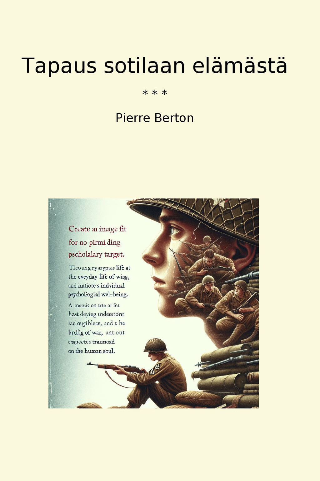 Pierre Bertonin klassikkoteos "Tapaus sotilaan elämästä" kertoo toisen maailmansodan aikana sotilaskohteeseen sijoitetun nuoren sotilaan elämästä ja kokemuksista. Kirja tarjoaa syvällisen ja henkilökohtaisen näkökulman sodan kauhuihin ja sen vaikutuksiin yksilön psykologiseen hyvinvointiin. Bertonin taitava kerrontatapa kuljettaa lukijan läpi sotilaan arjen, taisteluiden ja traumojen, paljastaen sodan raadollisuuden ja sen vaikutukset ihmisen sieluun. "Tapaus sotilaan elämästä" on ajaton teos, joka herättää lukijassa syvää empatiaa ja ymmärrystä sodan todellisuudesta ja sen ihmisiin kohdistamasta vaikutuksesta. Kirja on vangitseva ja tunteisiin vetoava lukukokemus, joka jättää jäljen lukijan sydämeen pitkäksi aikaa.