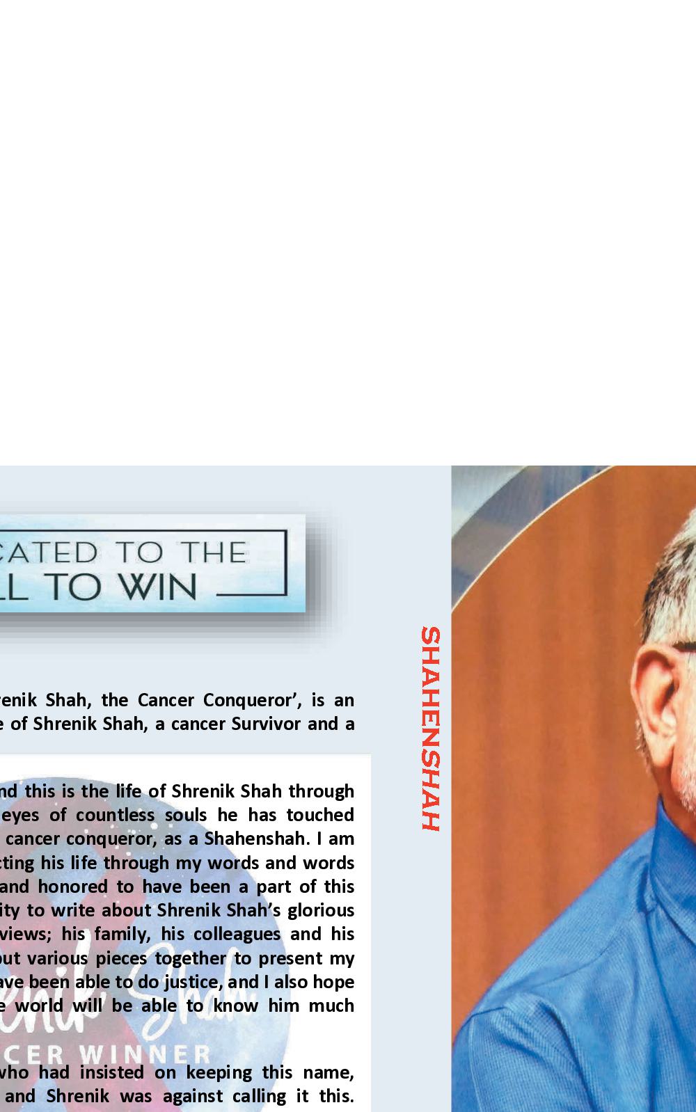*Shahenshah - King'Shahenshah - Story of Shrenik Shah, the Cancer Conqueror', is an overview of the glorious life of Shrenik Shah, a cancer Survivor and a Cancer Conqueror. I am Jasveer Singh Dangi, and this is the life of Shrenik Shah through my eyes and through the eyes of countless souls he has touched throughout his journey as a cancer conqueror, as a Shahenshah. I am merely the projector, projecting his life through my words and words of others. I feel privileged and honored to have been