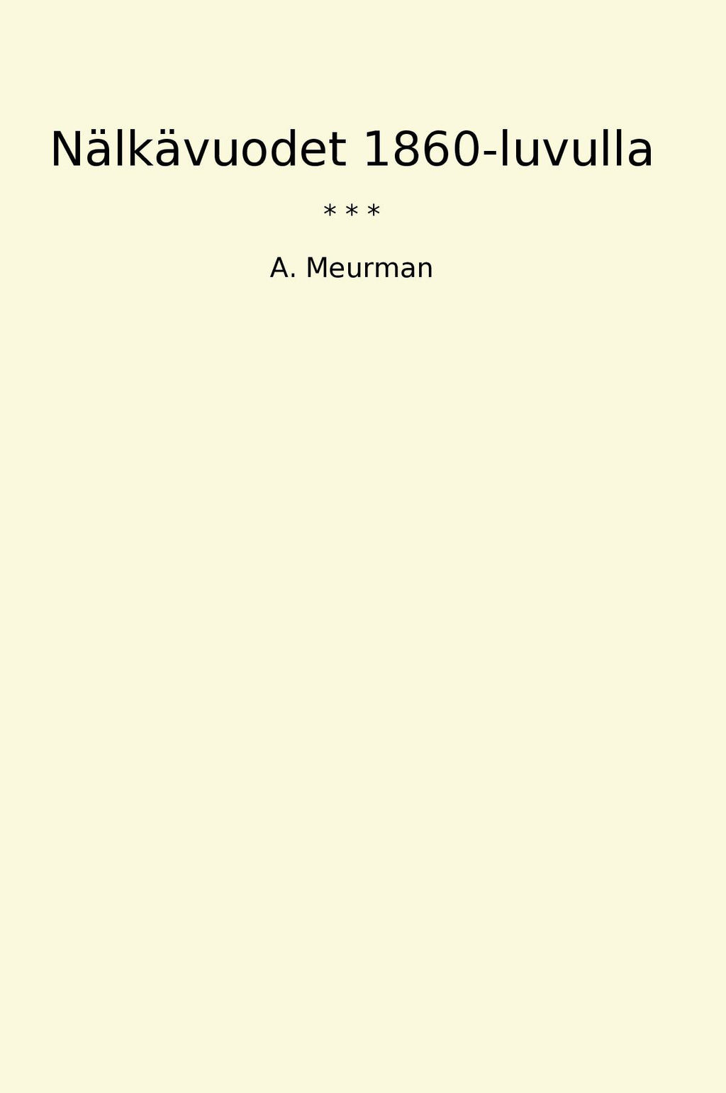 "Nälkävuodet 1860-luvulla" on suomalaisen kirjailijan ja kirjallisuuden tutkijan A. Meurmanin klassikkoteos. Kirja kertoo Suomen historian synkimmästä ajasta, 1860-luvun nälkävuosista. Teos tarjoaa syvällisen ja vaikuttavan kuvauksen elämästä ja kärsimyksestä, joka vallitsi tuona aikana.