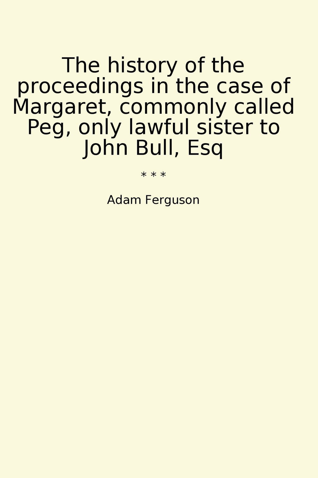 "The History of the Proceedings in the Case of Margaret, commonly called Peg, only lawful sister to John Bull, Esq" by Adam Ferguson is a classic satire that tells the story of Peg, the forgotten sister of the famous John Bull. Through a series of events, Peg finds herself embroiled in legal proceedings that highlight the absurdities of the law and society at the time. Author Adam Ferguson skillfully weaves a tale that is as entertaining as it is thought-provoking, with sharp wit and satire that pokes fun at the conventions of the day. A must-read for fans of political satire and social commentary, this book offers a glimpse into the injustices and hypocrisies of the past while still resonating with modern readers.