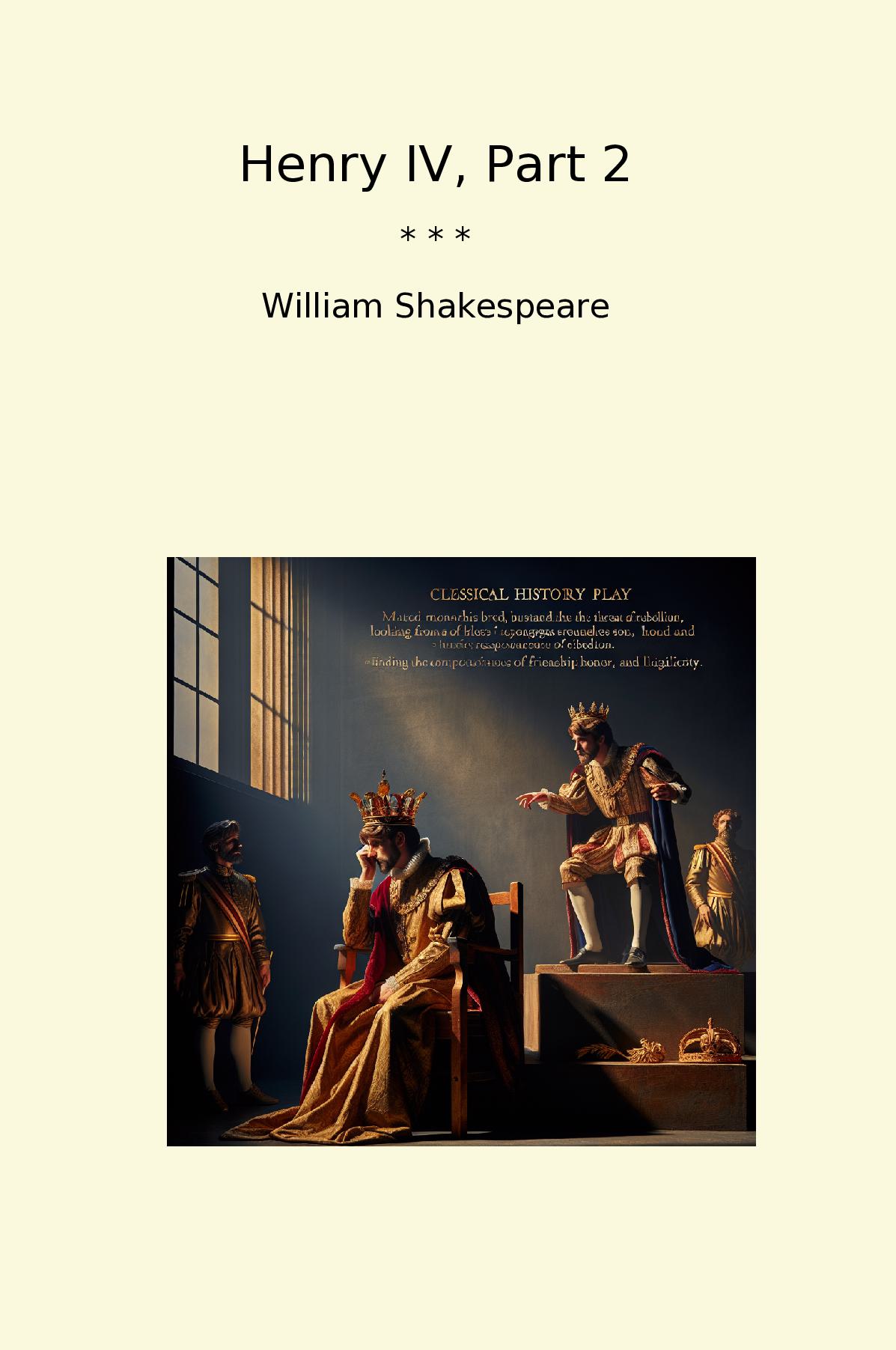 Henry IV, Part 2 is one of William Shakespeare's classical histories, continuing the exploration of leadership, loyalty, and the complexity of human nature introduced in its predecessor, Part 1. The play follows King Henry IV as he grapples with the burden of the crown, the threat of rebellion, and the challenges posed by his estranged son, Prince Hal. As Hal evolves from a wayward youth to a more responsible leader, the contrasting figure of Falstaff provides comic relief and profound commentary on friendship, honor, and the nature of power.The play intricately weaves together themes of legitimacy and identity, showing Hal's struggle to reconcile his past with his emerging responsibilities. Shakespeare's rich language and vivid characterizations invite the audience to reflect on the multifaceted nature of leadership. Henry IV, Part 2 is both a captivating narrative filled with political intrigue and a poignant examination of personal growth, culminating in Hal's transformation into King Henry V.