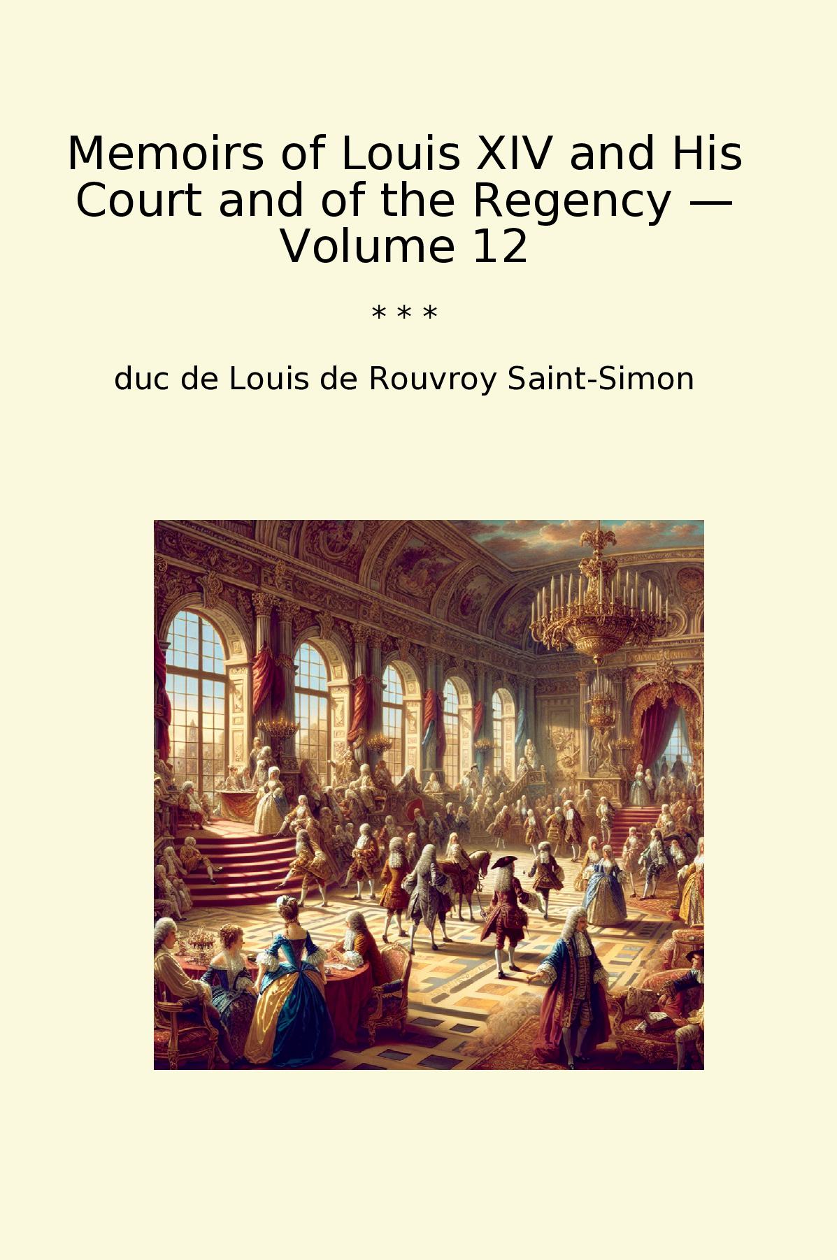Memoirs of Louis XIV and His Court and of the Regency — Volume 12 by the duc de Louis de Rouvroy Saint-Simon offers a fascinating glimpse into the lavish world of 17th-century France. This volume, part of a comprehensive series, presents a detailed narrative enriched by Saint-Simon’s astute observations and vivid storytelling. As a memoirist and courtier, he provides unique insights into the lives of Louis XIV, the Sun King, and the complex dynamics of his court.Saint-Simon's writing is marked by its attention to detail and character depth, revealing the intrigues, rivalries, and personal anecdotes that defined the era. The memoirs also delve into the Regency period that followed Louis XIV's reign, showcasing the shifting political landscape and the personalities that shaped it. The blend of history and personal reflection makes this work a vital resource for understanding French nobility and the intricacies of royal life during a transformative period in European history.