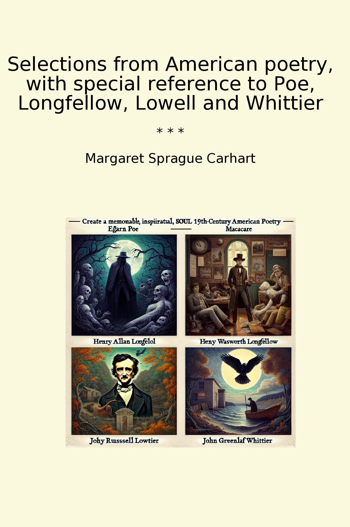 Selections from American Poetry, curated by Margaret Sprague Carhart, is an exquisite anthology celebrating the vibrant tapestry of 19th-century American poetry. This collection brings to life the works of towering figures such as Edgar Allan Poe, Henry Wadsworth Longfellow, James Russell Lowell, and John Greenleaf Whittier. Carhart artfully presents each poet's unique voice, showcasing Poe's eerie fascination with the macabre, Longfellow's lyrical mastery and narratives, Lowell's keen social consciousness, and Whittier's heartfelt connection to nature and humanity.The anthology allows readers to explore the emotional depth and diverse themes of American poetry during a pivotal era. Carhart's thoughtful selection and insightful commentary enhance the reader's experience, making it a valuable resource for both poetry enthusiasts and scholars. The collection not only honors the individual contributions of these poets but also highlights the collective spirit that defines American literary heritage, making it an essential read for those keen on understanding America's poetic evolution.