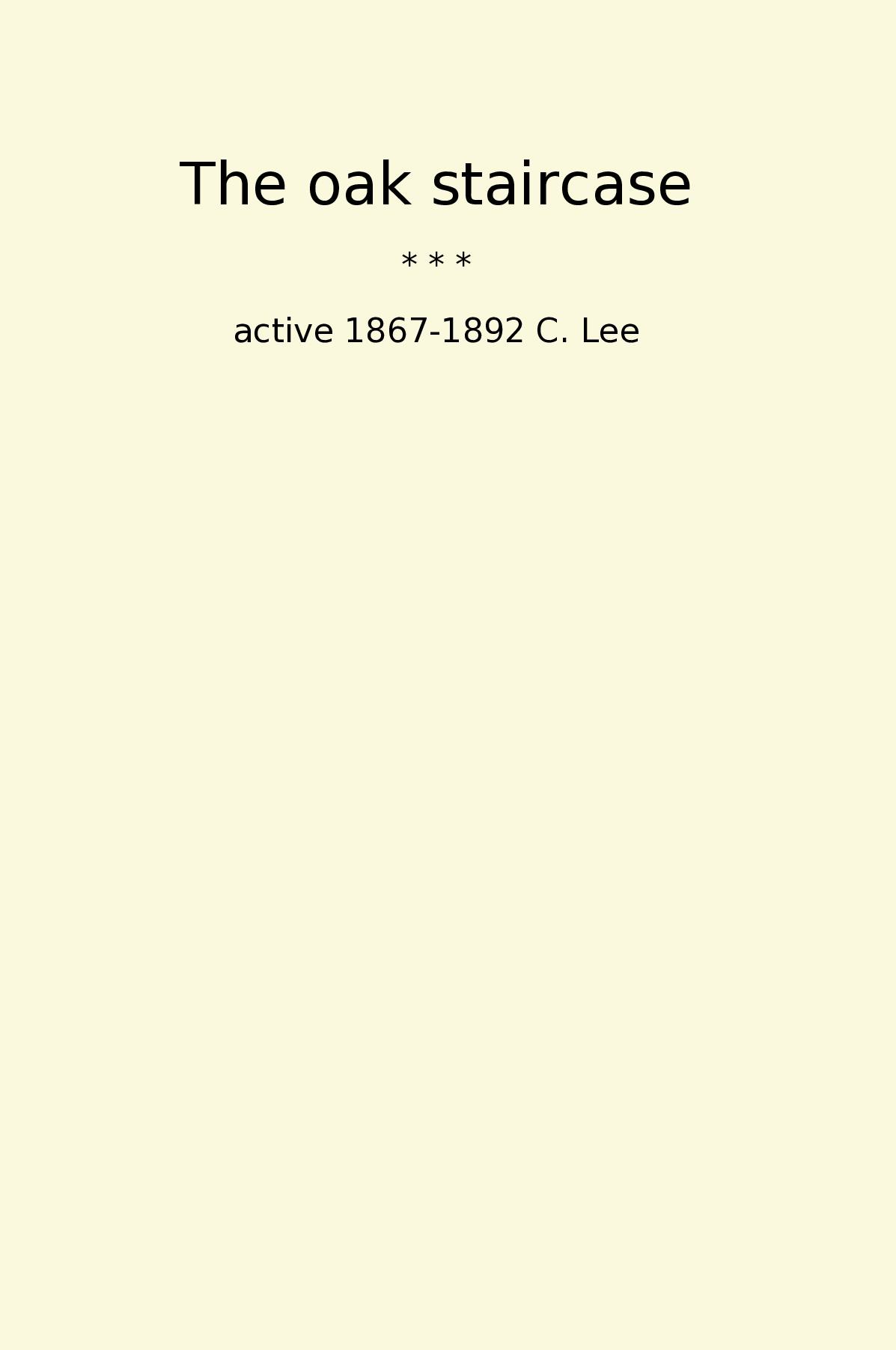 'The Oak Staircase' is a classic novel written by C. Lee, an author active between 1867 and 1892. The story takes place in a small village in England and follows the lives of two families, the Thompsons and the Harrisons. The novel explores themes of love, betrayal, and the struggle for social status in Victorian society.At the center of the story is a magnificent oak staircase that becomes a symbol of both the Thompson and Harrison families. The staircase not only connects the different floors of their homes but also represents their upward mobility and desire for a better life. As the families navigate their way through various challenges and obstacles, the oak staircase serves as a constant reminder of their intertwined destinies.'The Oak Staircase' is praised for its intricate and evocative portrayal of Victorian society, capturing the conflicts between social classes and the constraints imposed on women in that era. The novel is a compelling exploration of the human condition and the lengths people will go to in order to achieve their ambitions.