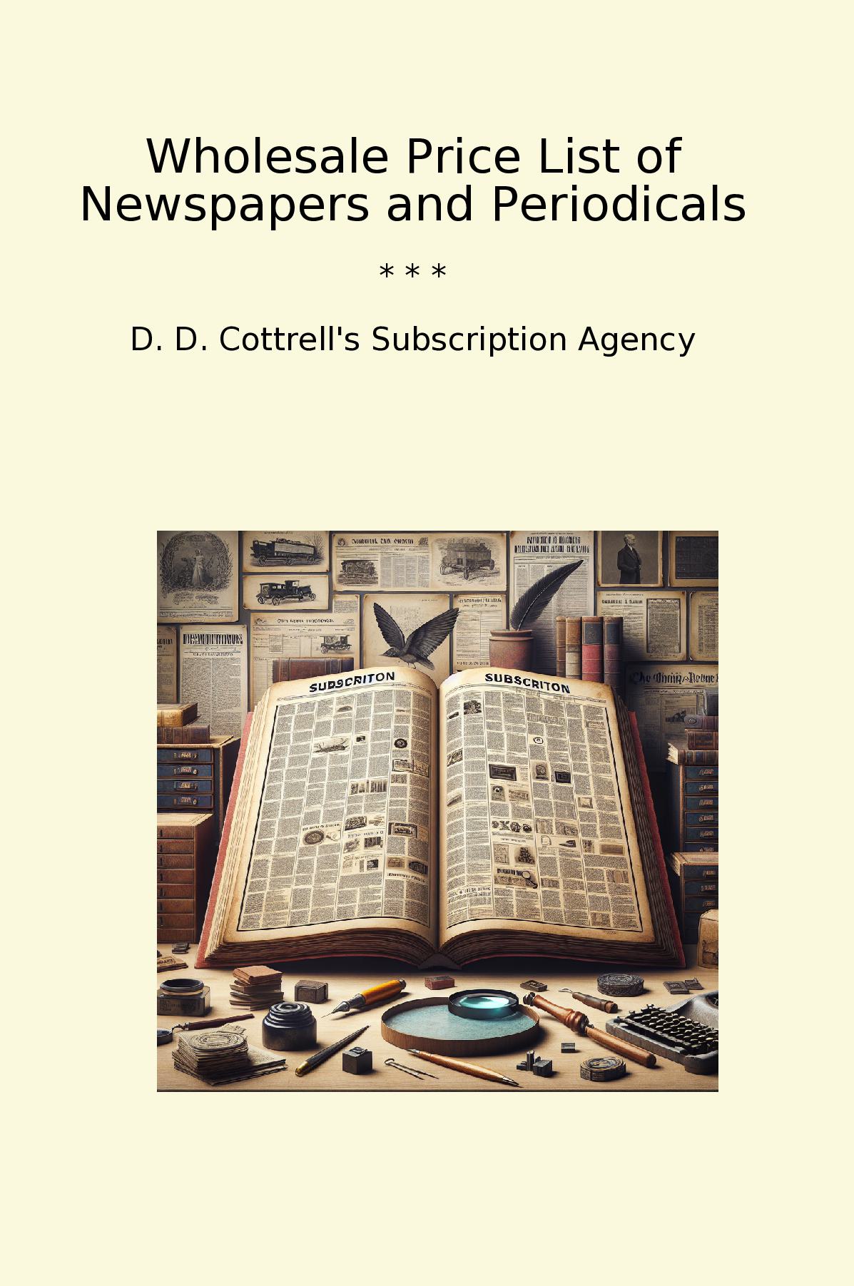 Wholesale Price List of Newspapers and Periodicals by D. D. Cottrell's Subscription Agency is a pivotal resource for bibliophiles, scholars, and anyone involved in the publishing industry. This classic reference book meticulously catalogues a vast array of newspapers and periodicals, offering detailed pricing and subscription information. Cottrell's work serves not only as a comprehensive guide for those seeking to stay informed about contemporary publications, but also as a historical document that reflects the publishing landscape of its time.With organized listings and a user-friendly format, readers can easily navigate through the extensive content, making it an invaluable tool for librarians, researchers, and avid readers alike. The book also highlights significant trends and shifts in media consumption, presenting insights into the evolution of print media. Overall, Cottrell's Wholesale Price List is more than just a price guide; it is a snapshot of the communication history that shaped the way we consume news and literature today.
