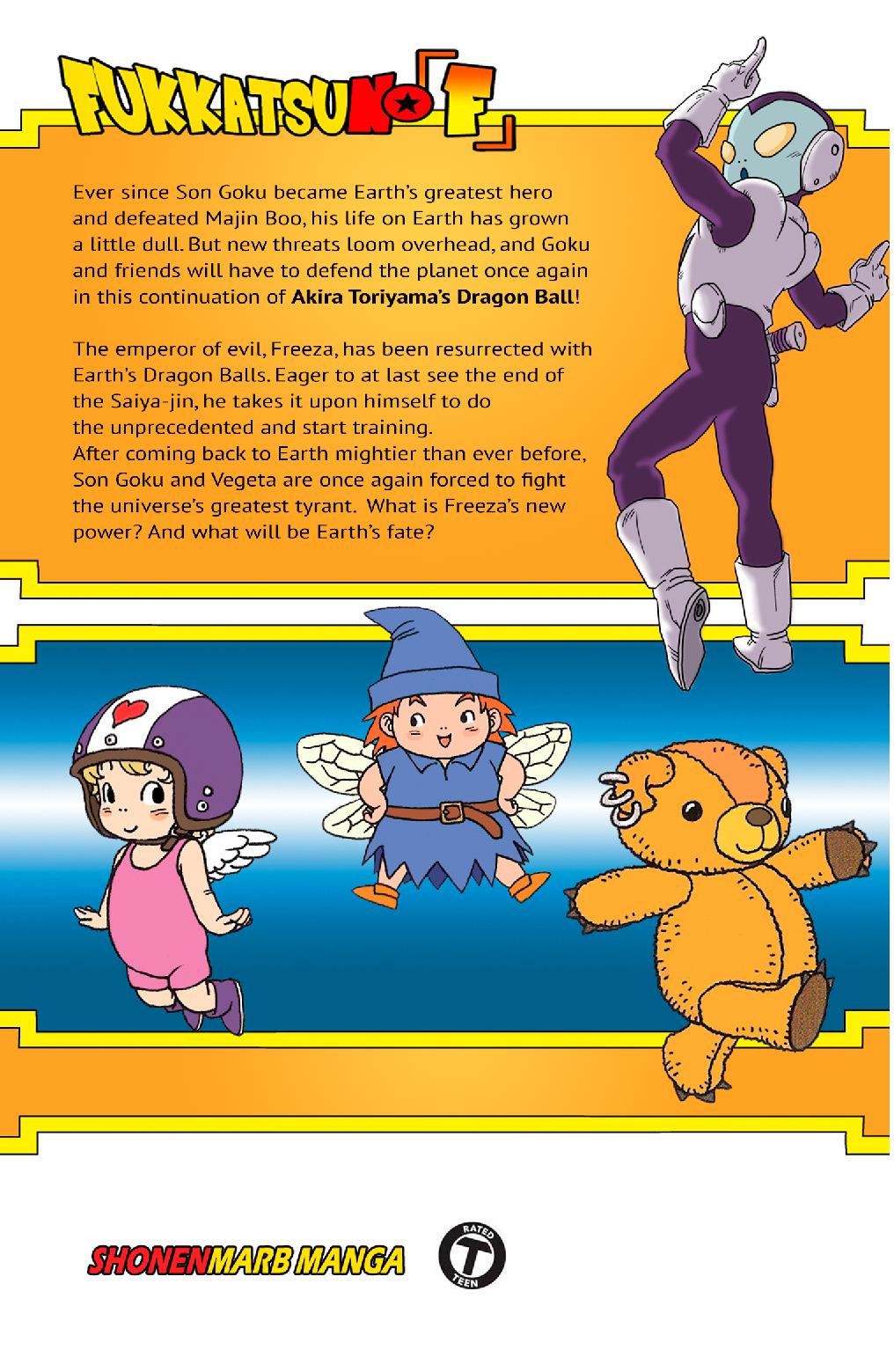 Ever since SG became Earth’s greatest hero and defeated MB, his life on Earth has grown a little dull. But new threats loom overhead, and G and friends will have to defend the planet once again in this continuation of DB! The emperor of evil, F, has been resurrected with Earth’s DBs. Eager to at last see the end of the Saiya-jin, he takes it upon himself to do the unprecedented and start training. After coming back to Earth mightier than ever before, SG and V are once again forced to fight the universe’s greatest tyrant. What is F’s new power? And what will be Earth’s fate?