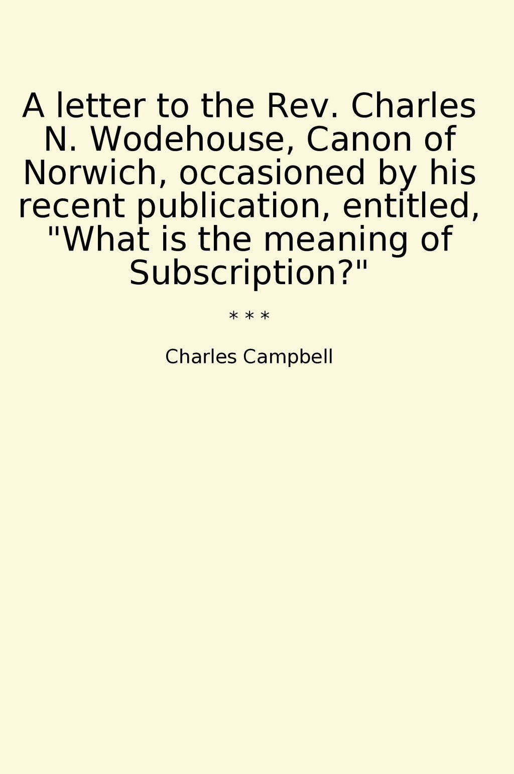 In "A Letter to the Rev. Charles N. Wodehouse," Charles Campbell critically examines Canon Wodehouse's publication on the meaning of subscription in a thoughtful and thought-provoking manner. Campbell delves into the complexities of religious subscription and challenges Wodehouse's arguments, offering a unique perspective on the topic. Through eloquent writing and thorough analysis, Campbell engages readers in a debate about the importance and implications of subscription in the context of religious faith. This classic book serves as a valuable contribution to the ongoing dialogue surrounding religious belief and commitment, making it a must-read for those interested in theology, philosophy, and religious studies.