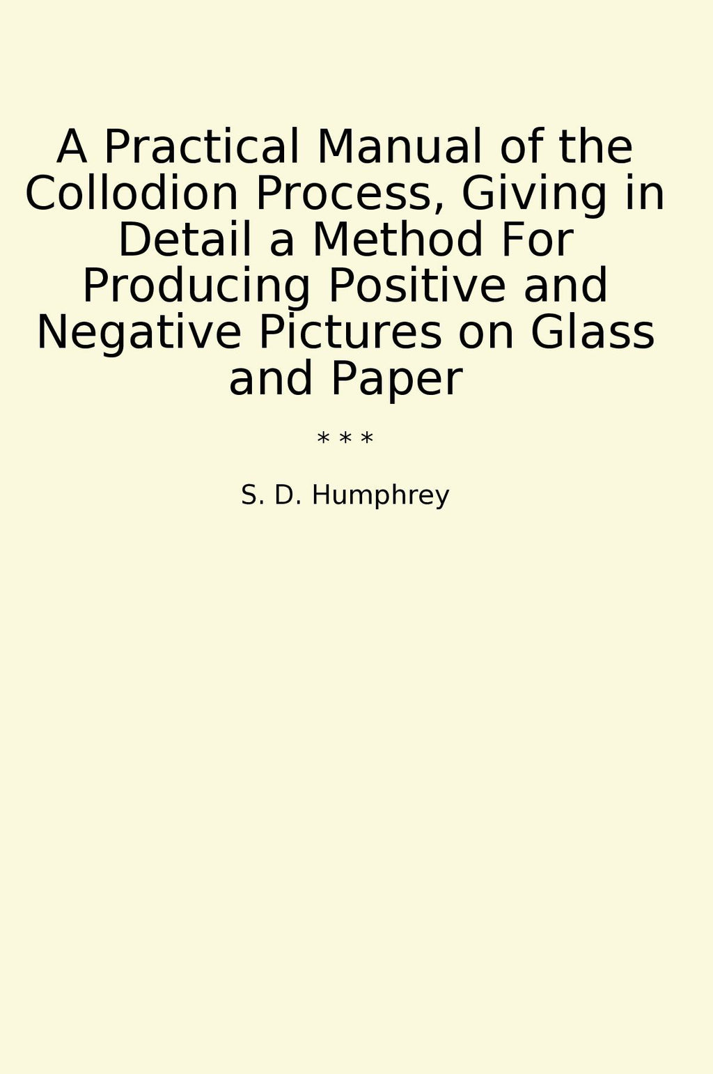 "A Practical Manual of the Collodion Process" by S.D. Humphrey is a classic book that provides detailed instructions on producing positive and negative pictures using the collodion process on both glass and paper. This manual serves as a comprehensive guide for photographers looking to enhance their skills in this traditional photographic technique. Written by expert S.D. Humphrey, this book offers insights into the technical aspects of the collodion process, making it an essential resource for anyone interested in learning or mastering this method of producing high-quality images. With clear and concise instructions, this Manual is a valuable tool for photographers seeking to delve deeper into the art of photography and explore the unique possibilities of the collodion process.