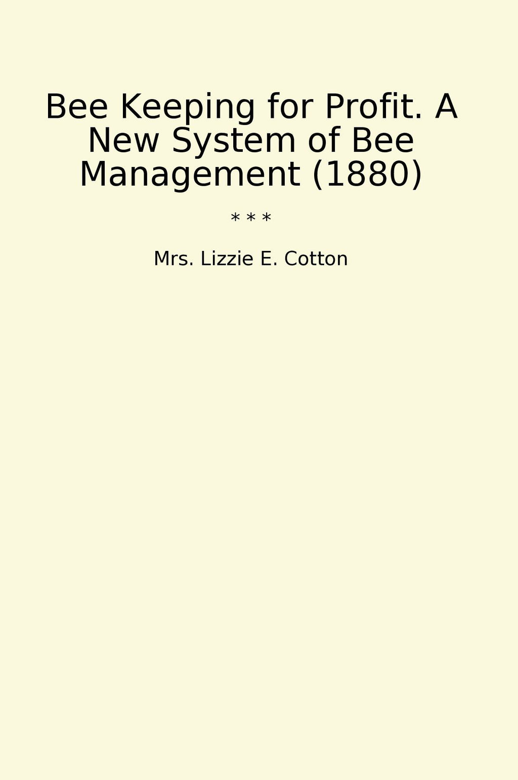 "Bee Keeping for Profit" by Mrs. Lizzie E. Cotton is a classic book from 1880 that presents a new system of bee management for maximizing profits. Mrs. Cotton shares her extensive knowledge and experience in beekeeping, offering practical advice on how to care for bees, manage hives, and increase honey production. This book serves as a valuable resource for both novice and experienced beekeepers looking to improve their skills and profitability in the industry. With detailed descriptions and insightful tips, Mrs. Cotton provides readers with the tools they need to succeed in beekeeping and turn it into a profitable venture. "Bee Keeping for Profit" is a timeless guide that continues to be relevant and helpful for beekeepers around the world.
