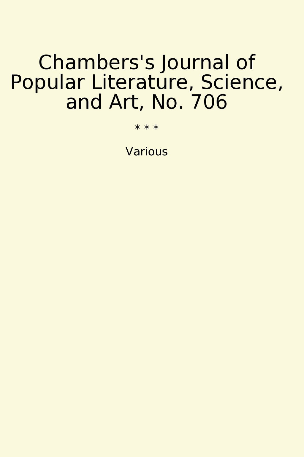 Chambers's Journal of Popular Literature, Science, and Art, No. 706 is a classic publication that offers a diverse range of content including literature, science, and art. This issue features a collection of engaging and informative articles that cover various topics of interest to readers. From thought-provoking essays to captivating fiction stories, this journal provides a well-rounded reading experience for those looking to expand their knowledge and enjoy quality writing. Whether you are interested in the latest scientific discoveries, exploring new works of art, or simply seeking to be entertained by engaging stories, Chambers's Journal delivers a mix of content that is both educational and entertaining. This timeless publication continues to captivate readers with its rich array of material that appeals to a wide audience.