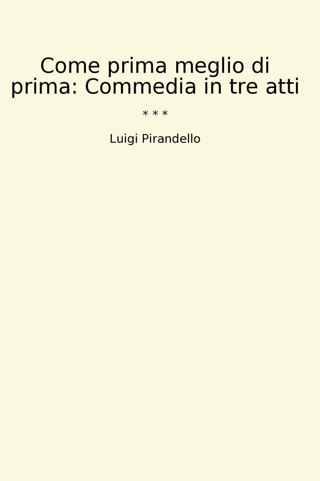 "Come prima meglio di prima" è una commedia scritta da Luigi Pirandello in tre atti. La storia si svolge a Roma e segue le vicende di due fratelli, Gianpaolo e Gaspare, che si trovano ad affrontare una serie di situazioni comiche e impreviste.