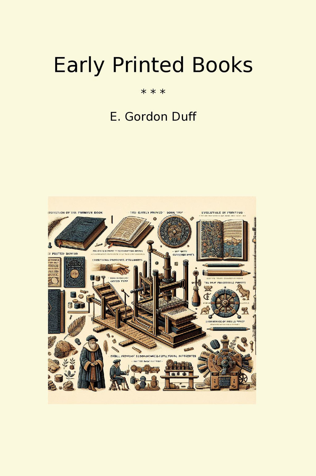 "Early Printed Books" by E. Gordon Duff is a seminal work in the field of bibliography and book history, providing a comprehensive overview of the early days of book printing. Duff explores the evolution of the printing press and its impact on the production and distribution of books, from the invention of movable type by Johannes Gutenberg to the spread of printing across Europe. With detailed analysis of key milestones in the history of printing, Duff sheds light on the technological, economic, and cultural factors that shaped the early book trade. This book is essential reading for scholars, researchers, and anyone interested in the history of books and printing. Duff's expertise and passion for the subject shine through in this engaging and informative study.