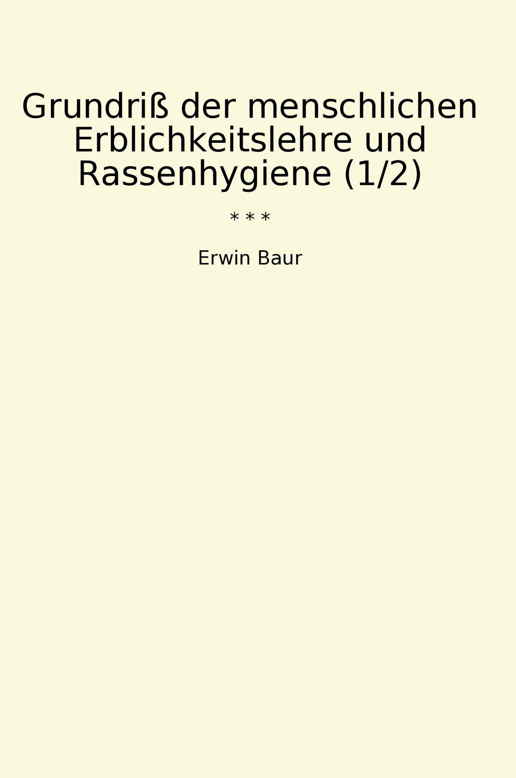 "Grundriß der menschlichen Erblichkeitslehre und Rassenhygiene" von Erwin Baur ist ein klassisches Buch, das wichtige Konzepte der Vererbungslehre und Rassenhygiene beleuchtet. Baur, ein renommierter Genetiker, bietet in diesem Werk eine detaillierte Analyse der genetischen Grundlagen von Merkmalen und ihrer Vererbung beim Menschen. Das Buch behandelt auch kontroverse Themen wie Eugenik und Rassenhygiene, wobei Baur wissenschaftliche Fakten von pseudowissenschaftlichen Ideologien klar trennt. Durch seine präzise und fundierte Darstellung liefert dieses Buch einen bedeutenden Beitrag zum Verständnis der menschlichen Genetik und ihrer Anwendung in der Gesellschaft. "Grundriß der menschlichen Erblichkeitslehre und Rassenhygiene" ist ein unverzichtbares Werk für alle, die sich für Genetik, Evolution und Ethik interessieren.