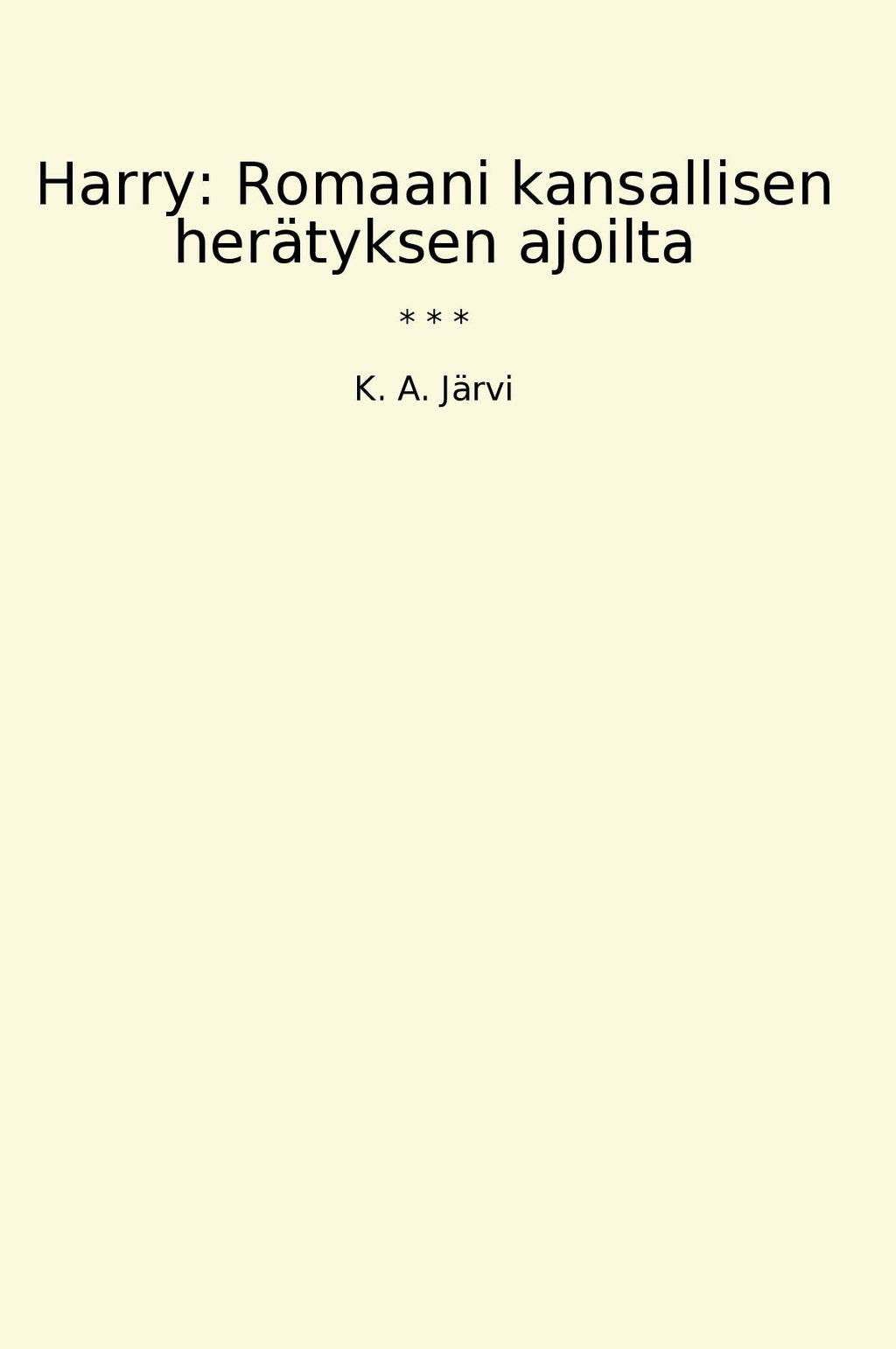 "Harry: Romaani kansallisen herätyksen ajoilta" on K.A. Järven klassikkoromaani, joka kertoo kiihkeästä nuorisoliikkeestä 1800-luvun Suomessa. Tarina seuraa nuoren Harryn matkaa vapahtaakseen isänmaansa sortovaltaa vastaan ja löytääkseen oman identiteettinsä. Kirjassa kuvataan aikakauden poliittisia ja yhteiskunnallisia levottomuuksia sekä nuoren sukupolven vallankumouksellista henkeä. Järven taitava kerronta ja tarkka historiallinen kuvaus tekevät romaanista vaikuttavan ja ajatuksia herättävän lukukokemuksen, joka ei jätä lukijaa kylmäksi. "Harry" on ajaton teos, joka puhuttelee edelleen suomalaisia lukijoita ja kertoo nuorisoliikkeen voimasta ja intohimosta paremman tulevaisuuden puolesta.