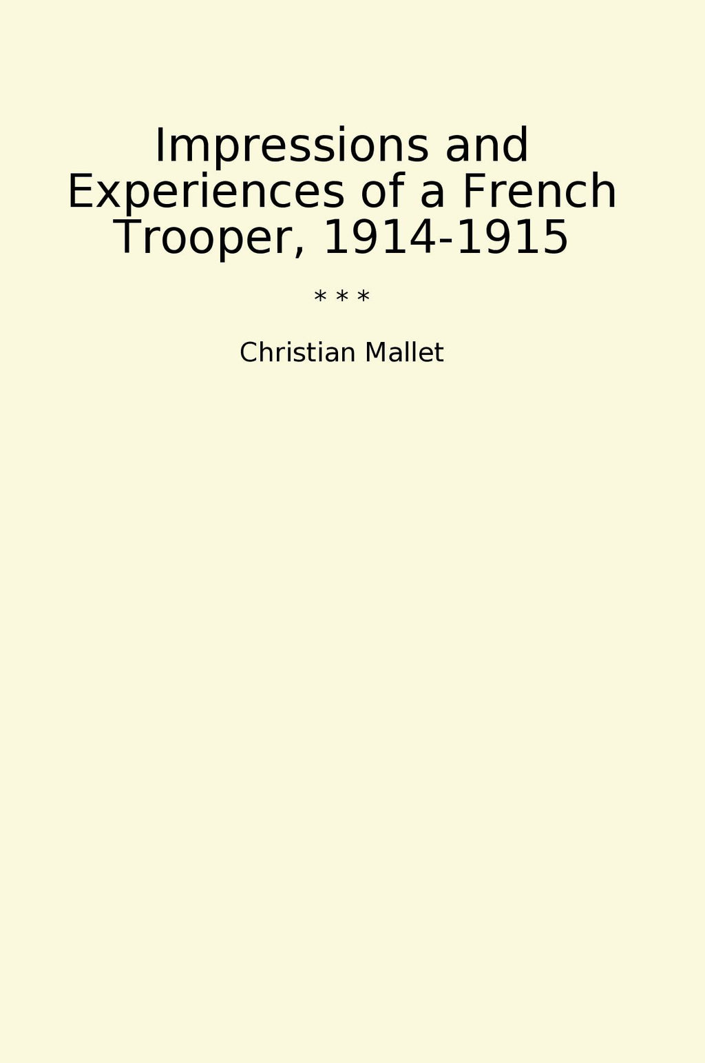 "Impressions and Experiences of a French Trooper, 1914-1915" is a classic book written by Christian Mallet that offers a firsthand account of life as a French soldier during World War I. Through the eyes of a trooper, the reader is taken on a poignant journey through the hardships, camaraderie, and challenges faced on the front lines. Mallet's writing provides a vivid and honest portrayal of the realities of war, capturing the fear, bravery, and humanity of those who served. This book is a powerful and compelling read that gives an intimate insight into the experiences of a soldier during one of the most tumultuous periods in history. A must-read for anyone interested in personal narratives of war and the human experience.