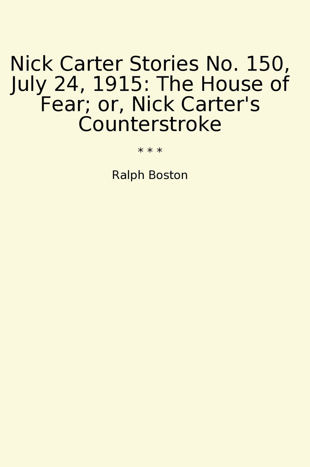 In "Nick Carter Stories No. 150, July 24, 1915: The House of Fear; or, Nick Carter's Counterstroke" by Ralph Boston, readers are taken on a thrilling adventure with the legendary detective Nick Carter. In this classic tale, Carter finds himself up against a mysterious adversary in a sinister house that exudes fear and danger at every turn. As he unravels the secrets of the House of Fear, Carter uses his keen intellect and quick wit to outsmart his foes and ultimately deliver justice in a thrilling counterstroke. Boston's writing captures the essence of the early 20th-century detective genre, with its gripping plot twists and daring heroics that keep readers on the edge of their seats. Fans of classic detective fiction will thoroughly enjoy this riveting installment in the Nick Carter series.