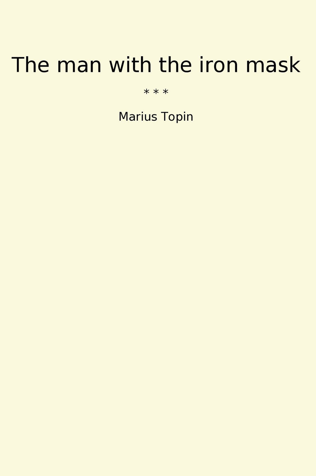"The Man with the Iron Mask" is a classic novel written by Marius Topin. Set in 17th-century France, the story follows the mysterious prisoner known as the man with the iron mask. Locked away in a remote island prison, the man's identity and the reason for his imprisonment are shrouded in mystery.