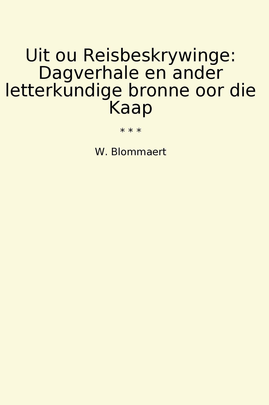 "Uit ou Reisbeskrywinge: Dagverhale en ander letterkundige bronne oor die Kaap" geskryf deur W. Blommaert, is 'n klassieke boek wat 'n verskeidenheid van reisverslae en ander letterkundige bronne oor die Kaap bevat. Die boek bied 'n boeiende blik op die geskiedenis en kultuur van die Kaap deur die oë van verskeie skrywers en ontdekkingsreisigers. Die leser word meegesleur op 'n reis deur die tyd terwyl hulle meer te wete kom oor die kleurryke verlede van hierdie gewilde bestemming. Hierdie boek is 'n absolute aanwins vir enige persoon wat belangstel in die geskiedenis van die Kaap en die verhale wat dit te bied het. Met 'n meesleurende styl en versameling bronne is dit 'n moet-lees vir enige liefhebber van geskiedenis en letterkunde.