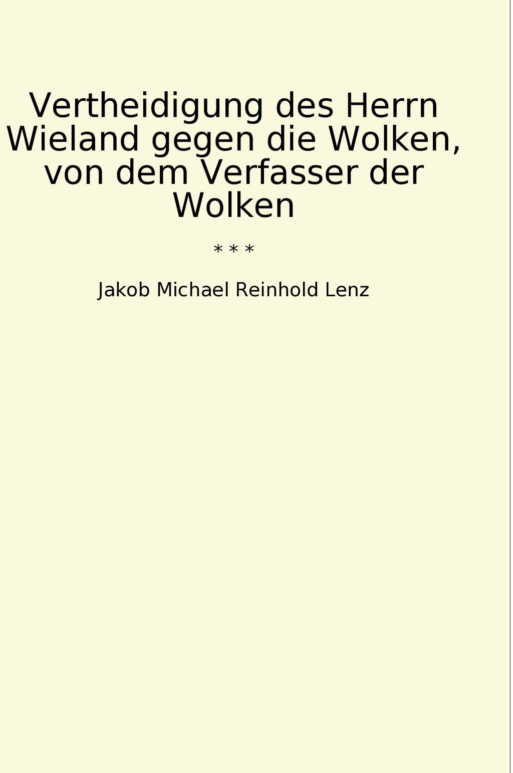 "Vertheidigung des Herrn Wieland gegen die Wolken" ist ein bedeutendes literarisches Werk, das von Jakob Michael Reinhold Lenz verfasst wurde. Der Autor ist bekannt für seinen einzigartigen Schreibstil und seine tiefgründigen Werke. In diesem Buch verteidigt er den bekannten Schriftsteller Christoph Martin Wieland gegen die Angriffe von Johann Wilhelm Ludwig Gleim in seinem Werk "Die Wolken". Lenz nutzt seine scharfe Feder, um die Vorwürfe gegen Wieland zu widerlegen und bringt dabei seine eigene literarische Kritik zum Ausdruck. Das Werk beeindruckt durch seine ironische und kritische Auseinandersetzung mit literarischen Fragen und zeigt Lenz als einen der führenden Köpfe der deutschen Literaturgeschichte. "Vertheidigung des Herrn Wieland gegen die Wolken" ist ein Must-read für alle, die sich für deutsche Klassik und Literaturkritik interessieren.